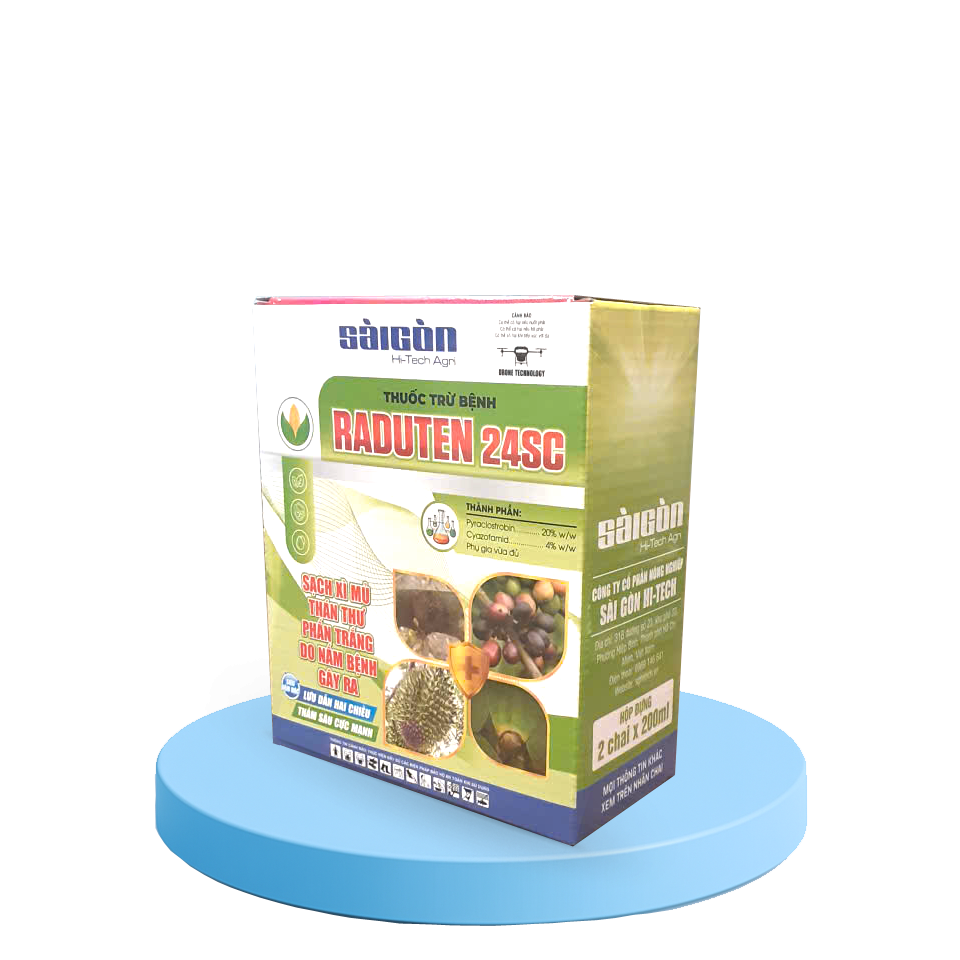 Raduten 24SC với hai hoạt chất Pyraclostrobin và Cyazof- amid là thuốc trừ nấm được kết hợp phòng trừ hiệu quả trên các đối tượng đạo ôn, lem lép hạt trên cây trồng. Ngoài ra thuốc còn gián tiếp bảo vệ bộ lá đòng làm cho hạt chắc khỏe và sáng bóng dẫn đến tăng năng suất cây trồng. Sản phẩm được đăng ký trừ bệnh giả sương mai trên dưa chuột.